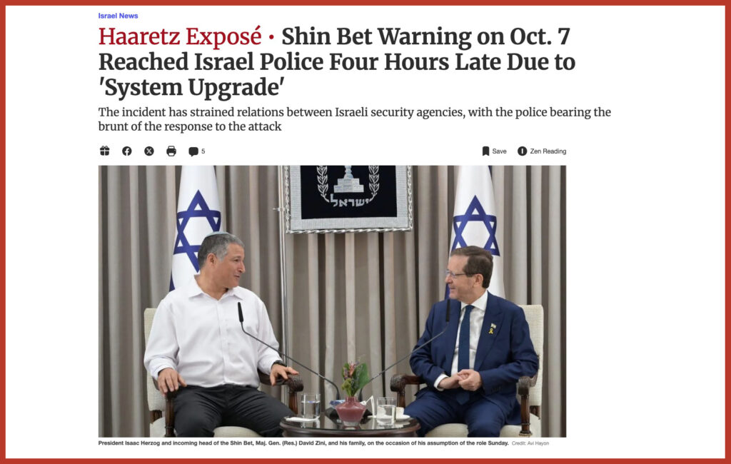 Lo Shin Bet, sicurezza interna, allarmò la polizia sulla attività sospette di Hamas alle 3.03 del 7 ottobre, ma l’allarme arrivò solo alle 7.03 del mattino, a invasione in corso, a “causa di un aggiornamento del sistema” informatico (non hanno i cellulari?).