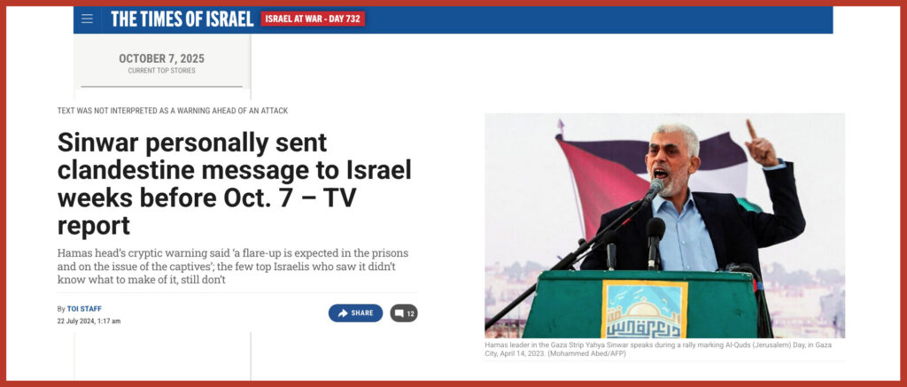 Non si tratta di una nostra interpretazione, ma quanto scriveva il Timesofisrael. Infatti, annotava il media israeliano, il messaggio “mette in luce in modo drammatico gli eventi del 7 ottobre” e contiene dettagli che “a nostro avviso, col senno di poi, si riveleranno niente meno che storici”.