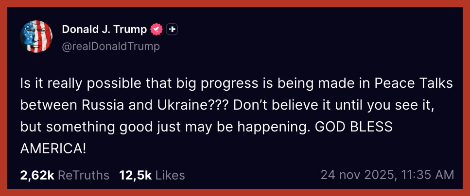 Ma – appunto – tanto ottimismo stride con il commento prudente di Trump, che suona insolito anche per la propensione del personaggio a brandire successi immaginari. Così, infatti, Trump su Truth social: “È davvero possibile che si stiano facendo grandi progressi nei colloqui di pace tra Russia e Ucraina??? Non crederci finché non lo vedi, ma potrebbe succedere qualcosa di buono”.